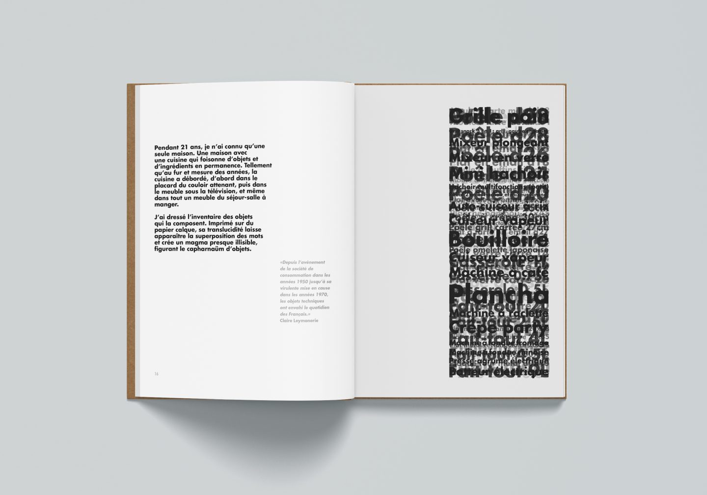 This introspection is the methodical analysis of the changing way in which we consume and inhabit the kitchen, and of our relationship with the very act of cooking. Modes and habits of food consumption are challenged from a very personal perspective. The polymorphic project uses tools of expression other than writing and is interspersed with appendices. The ensemble forms strata illustrating the complexity of a way of thinking. The dissertation is based on the deconsumption movement observed from the early 21st century. The kitchen is central to the challenges of this transition towards more environmentally-friendly, sound and virtuous consumption.