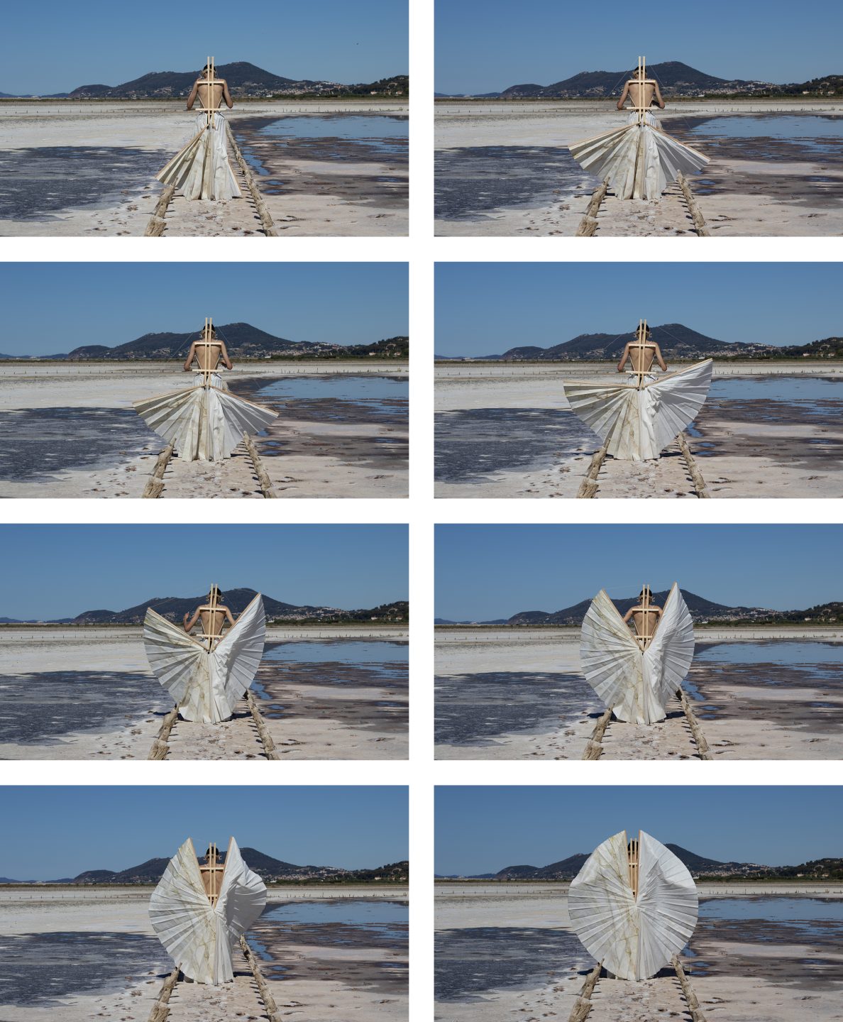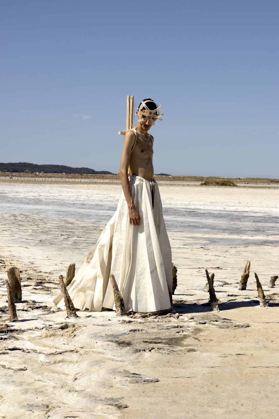 Performance effectuée par Joaquim Marques aux Salins des Pesquiers à Hyères. Ce personnage Icarien évolue dans ce lieu désolé, recouvert de sel d’où émane une atmosphère apocalyptique. Il communique avec le costume, lui donnant vie par le mouvement, dans le but de s’envoler de nouveau vers les cieux.