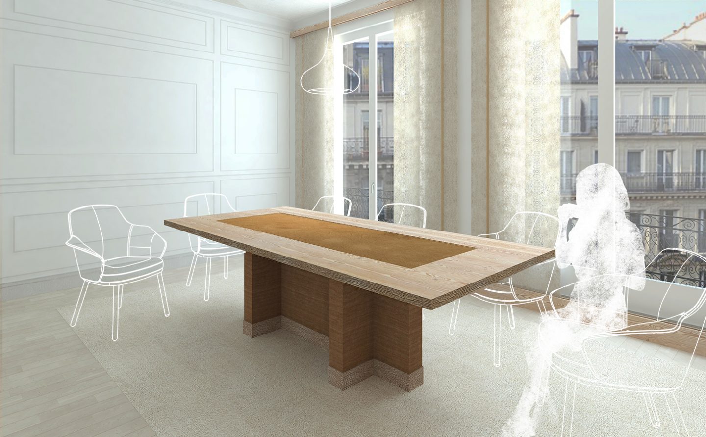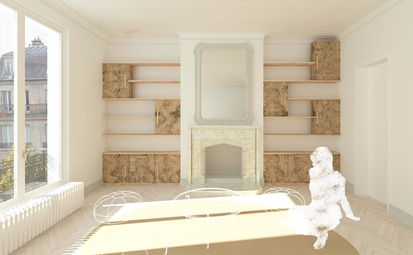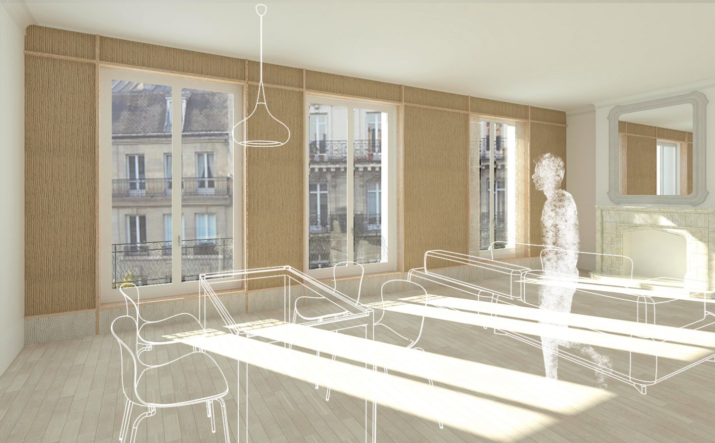 Urban frugality is a development project for a Haussmann-era apartment, which proposes a new architectural language based on bio-geosourced materials such as raw earth, wood, stone, cellulose and wool. The aim is to highlight the raw material in its most natural aspect in order to benefit from its ecological and technical advantages while asserting its raw aesthetic. This project therefore explores the rural and rustic connotations usually attributed to these materials in order to overcome them by confronting them with a sophisticated urban universe and thus testify to their creative potential.