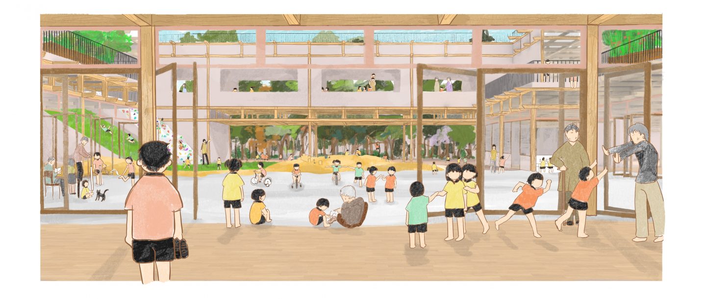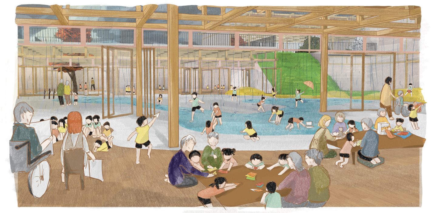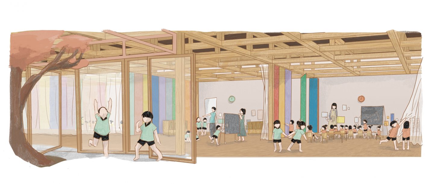 What if the square, highly structured building and the rolling, freeform valley were absorbed into one another, becoming entangled. If the building, split into classes, could easily be transformed into a single space that blended in with the garden. Wouldn't a nursery school like this be a paradise of learning for the children? Located in Tokyo, Momogo-en will be an exceptional site featuring a nursery school, childcare centre and area for hosting seniors. The presence of 280 children and 70 seniors will stimulate intergenerational interactions. In the morning, shoji and fusuma will close off the classrooms, allowing for structured learning. In the afternoon, these modular partitions will open to reveal an entirely open-plan space, encouraging carefree discovery.