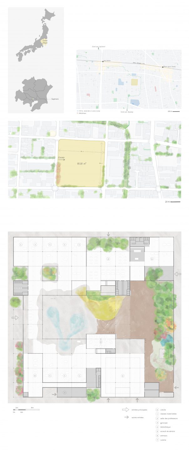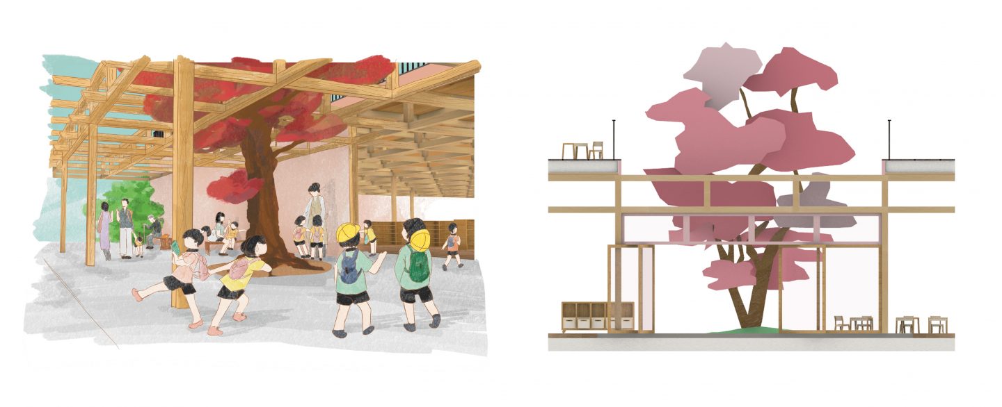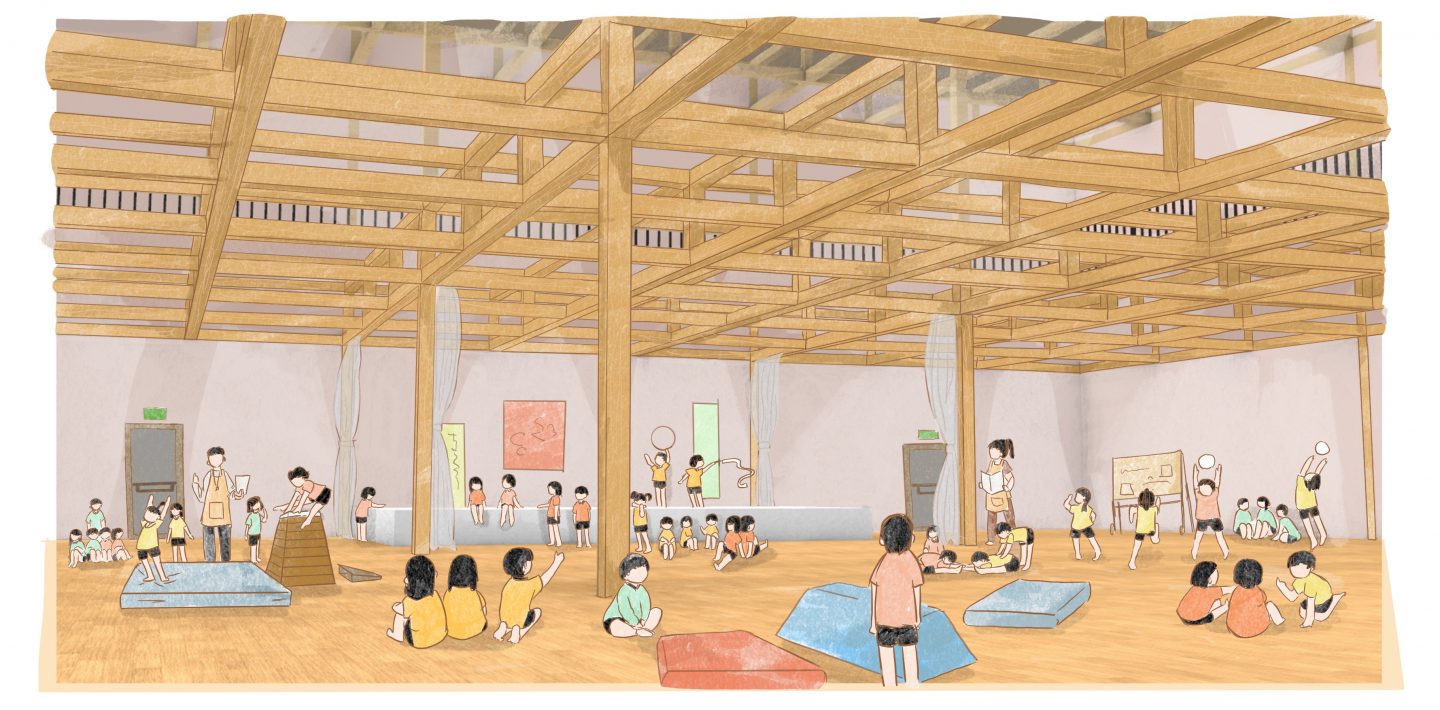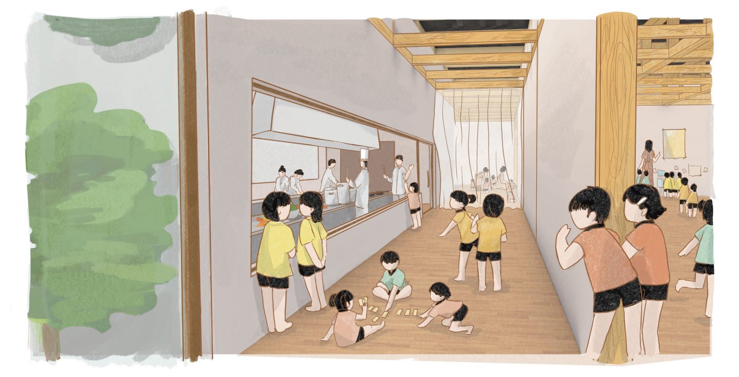 What if the square, highly structured building and the rolling, freeform valley were absorbed into one another, becoming entangled. If the building, split into classes, could easily be transformed into a single space that blended in with the garden. Wouldn't a nursery school like this be a paradise of learning for the children? Located in Tokyo, Momogo-en will be an exceptional site featuring a nursery school, childcare centre and area for hosting seniors. The presence of 280 children and 70 seniors will stimulate intergenerational interactions. In the morning, shoji and fusuma will close off the classrooms, allowing for structured learning. In the afternoon, these modular partitions will open to reveal an entirely open-plan space, encouraging carefree discovery.