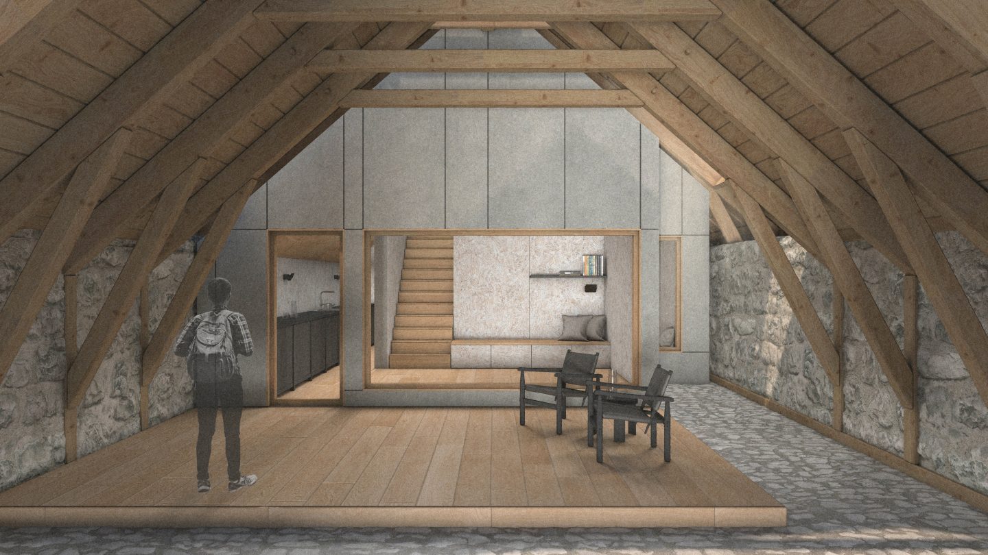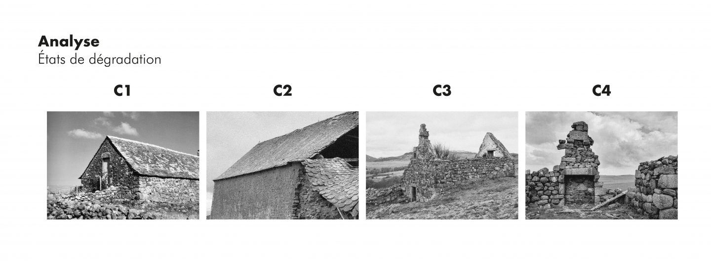 Le buron de Grandval, réhabilité en gîte d’étapes, va offrir aux randonneurs une pause, le temps d’une nuit, un point d’étapes sur leur chemin. L’intervention est localisée au centre du buron, sous la ruine, afin de bénéficier du plus de lumière naturelle possible.