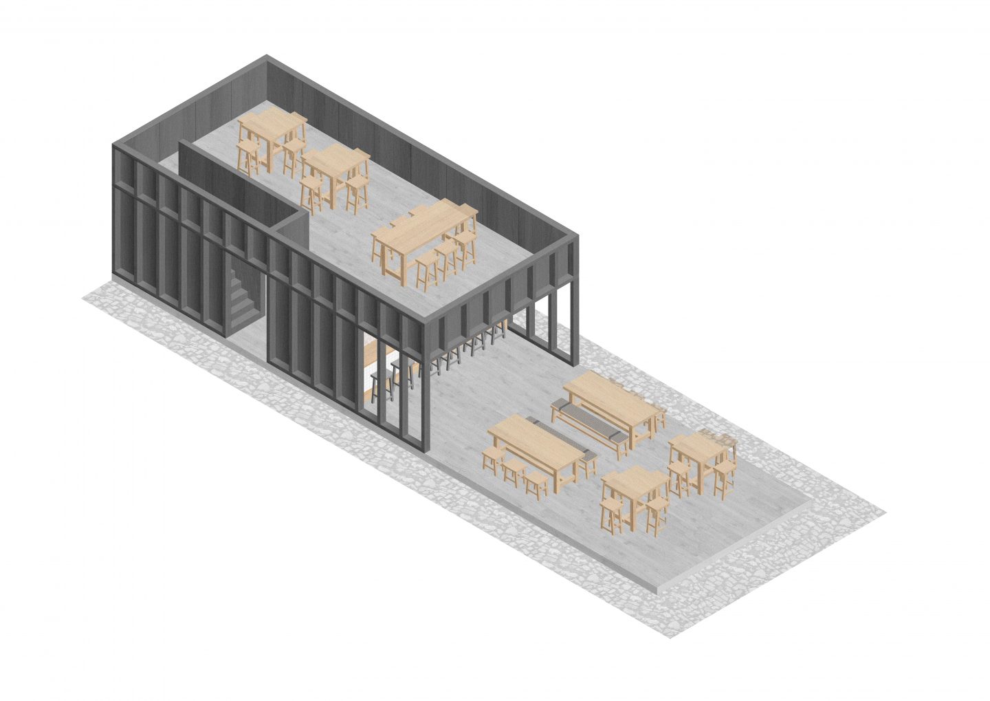 Le volume n’ayant pas besoin d’être isolé comme le précédent, la structure porteuse est laissée apparente depuis l’extérieur, créant une trame qui va venir rythmer les surfaces du volume.