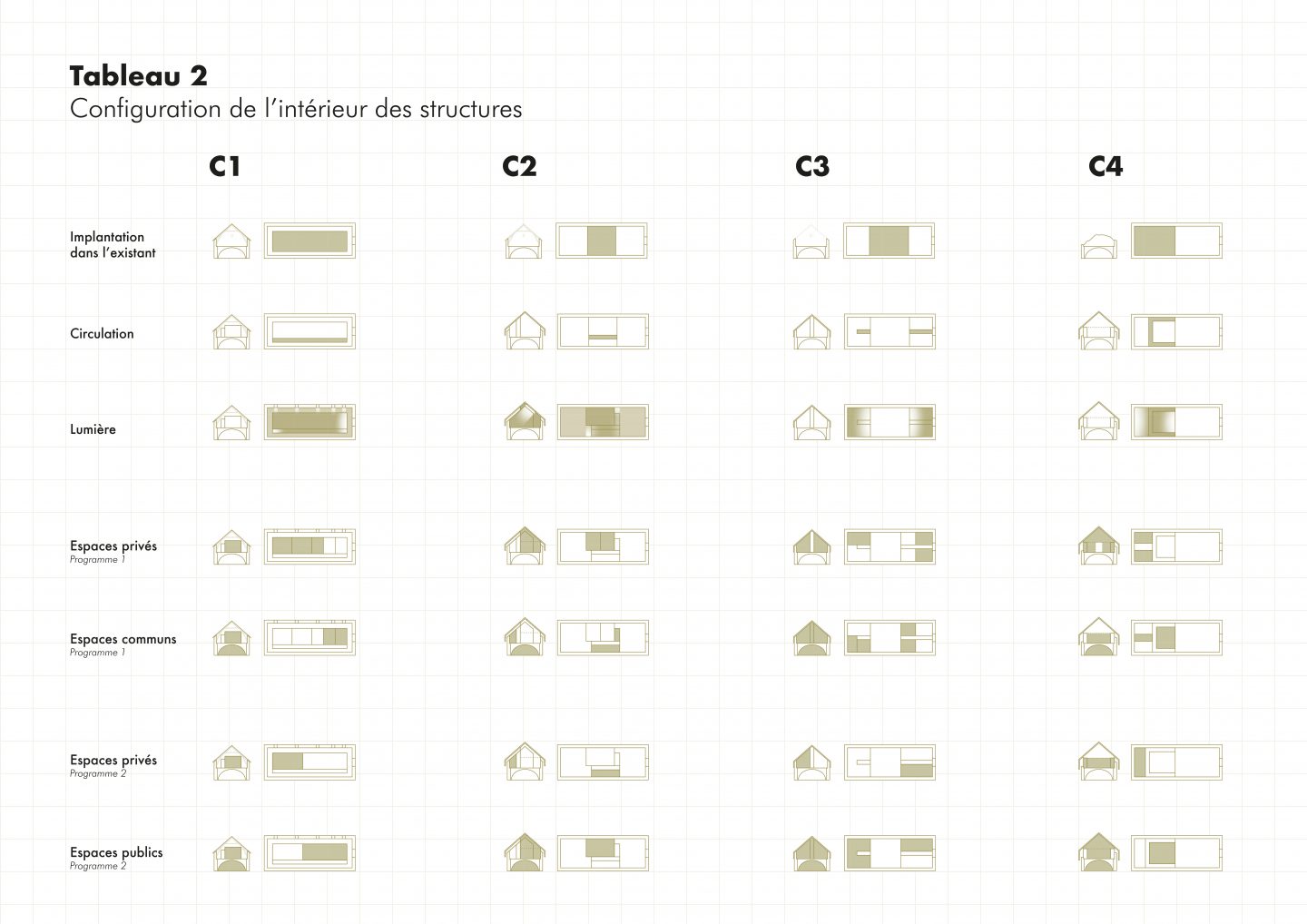 Ce protocole vise à créer une stratégie d’intervention adaptable et applicable à tous ces habitats. De nouvelles structures habitables sont crées afin d’y loger les nouveaux programmes. Ces interventions sont réversibles, et ne s’appuient pas sur la structure existante, la ruine est figée dans son état actuel.
