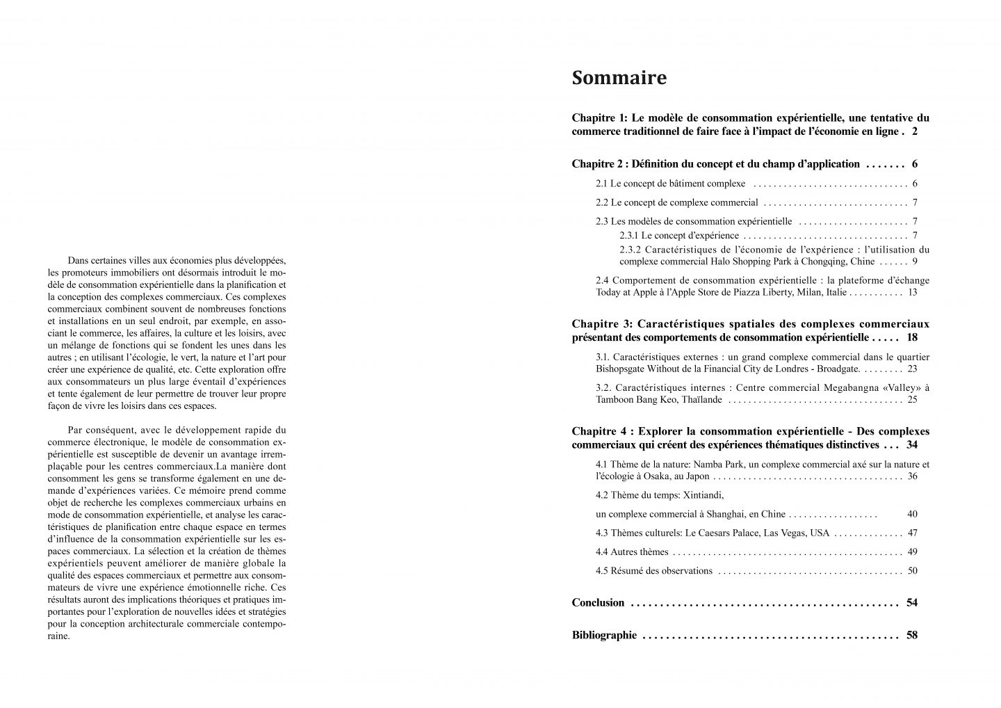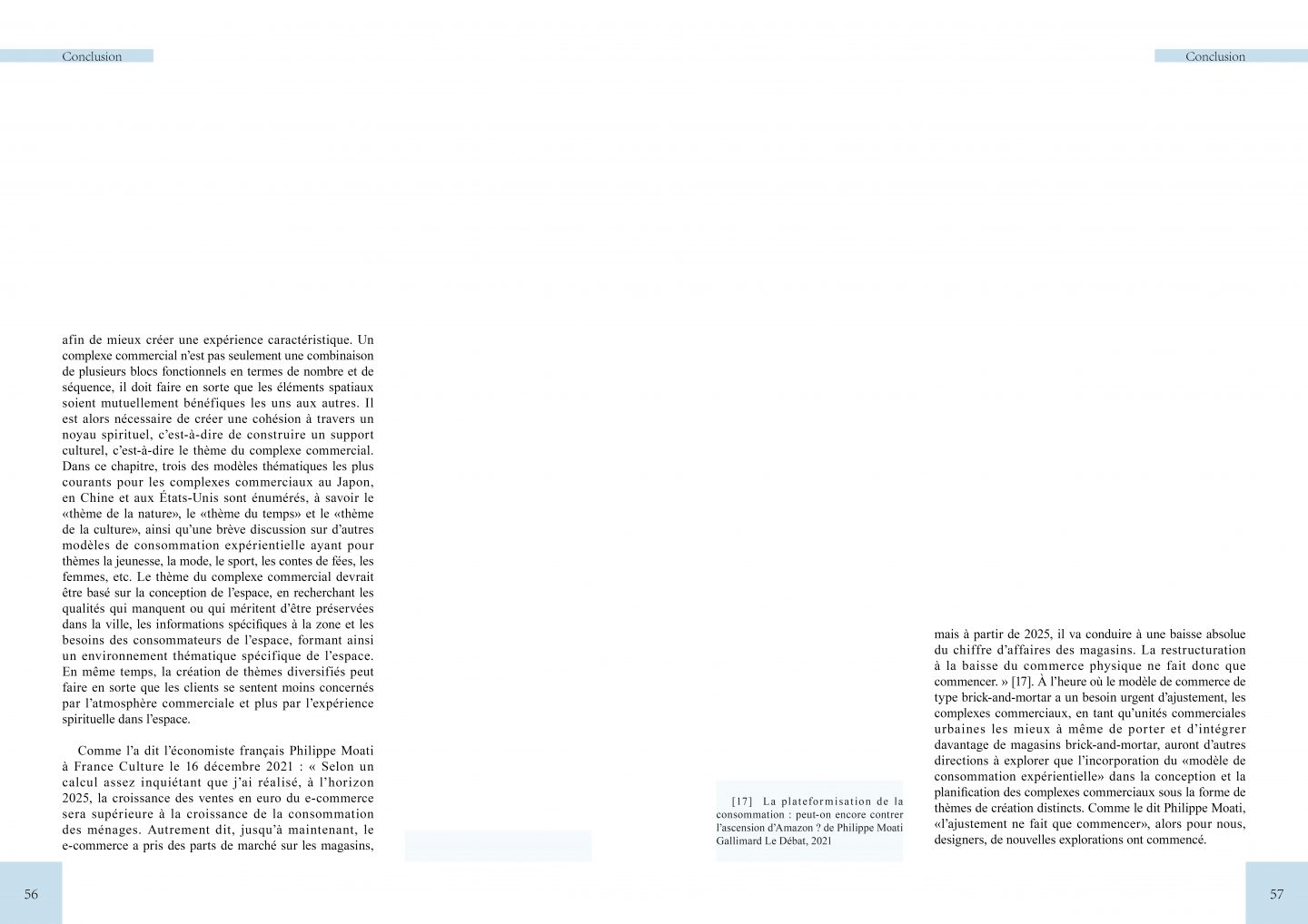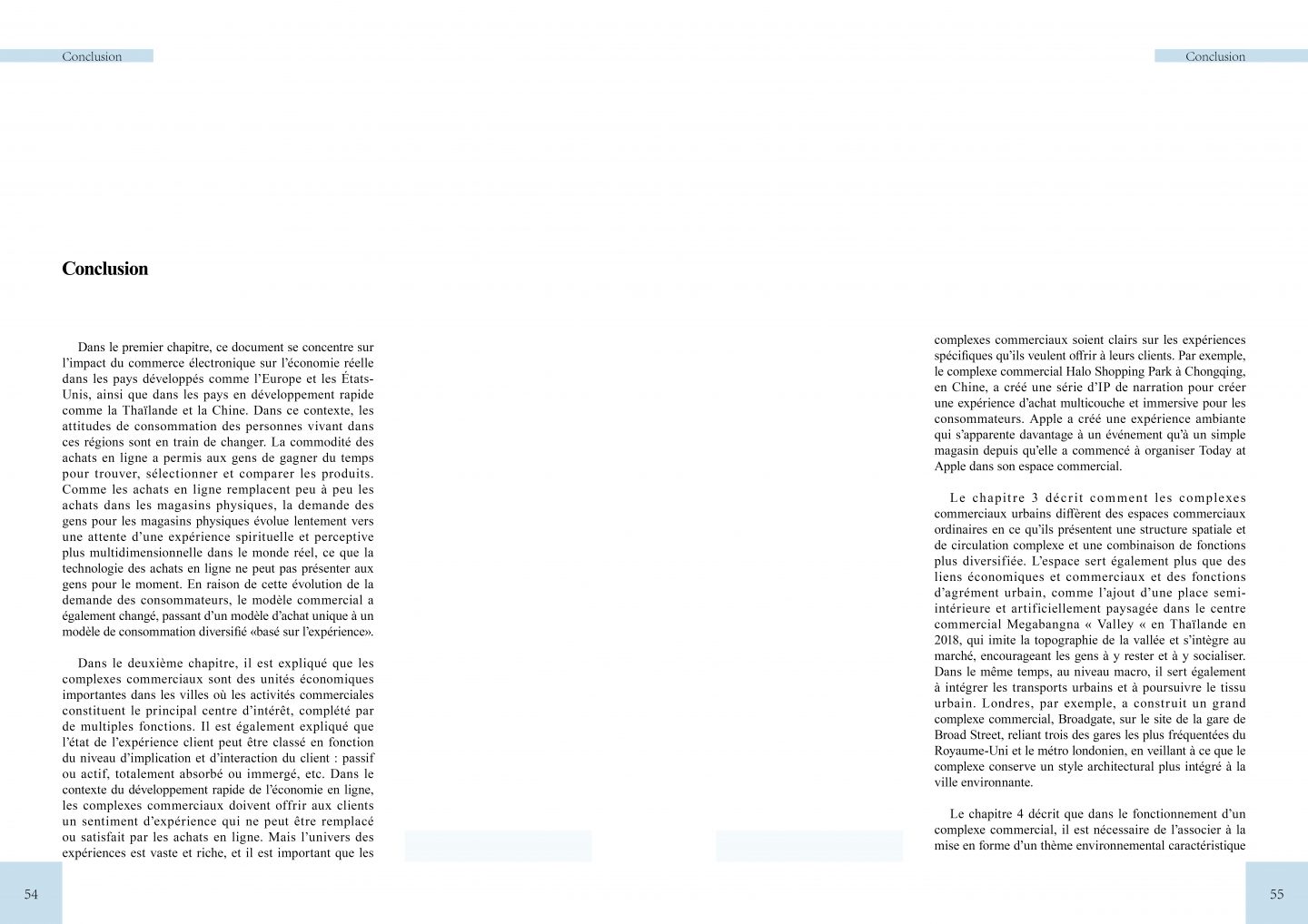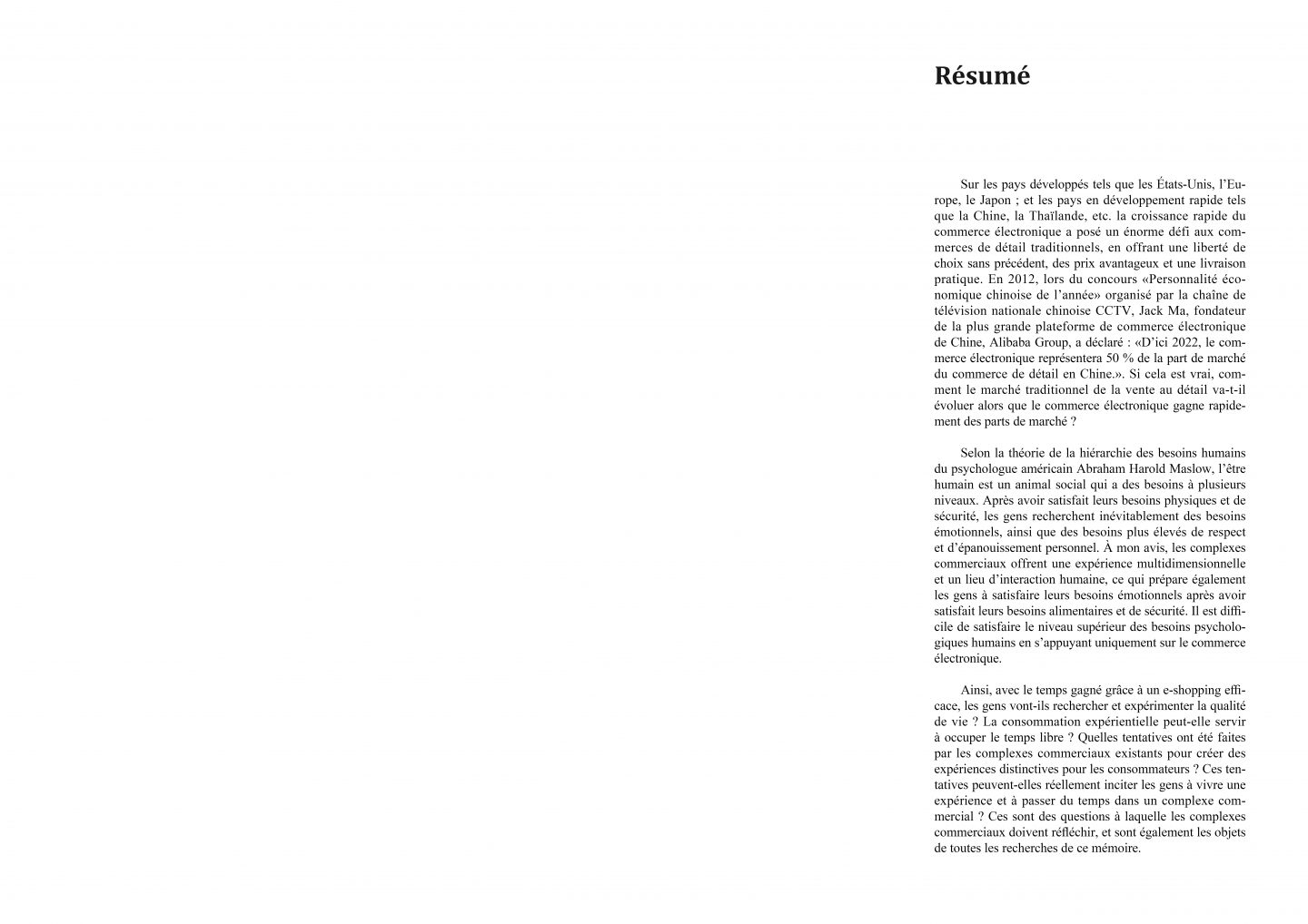 Avec le développement rapide du commerce électronique, le modèle de consommation expérientielle est susceptible de devenir un avantage irremplaçable pour les centres commerciaux.La manière dont consomment les gens se transforme également en une demande d’expériences variées. Ce mémoire prend comme objet de recherche les complexes commerciaux urbains en mode de consommation expérientielle, et analyse les caractéristiques de planification entre chaque espace en termes d’influence de la consommation expérientielle sur les espaces commerciaux. La sélection et la création de thèmes expérientiels peuvent améliorer de manière globale la qualité des espaces commerciaux et permettre aux consommateurs de vivre une expérience émotionnelle riche.