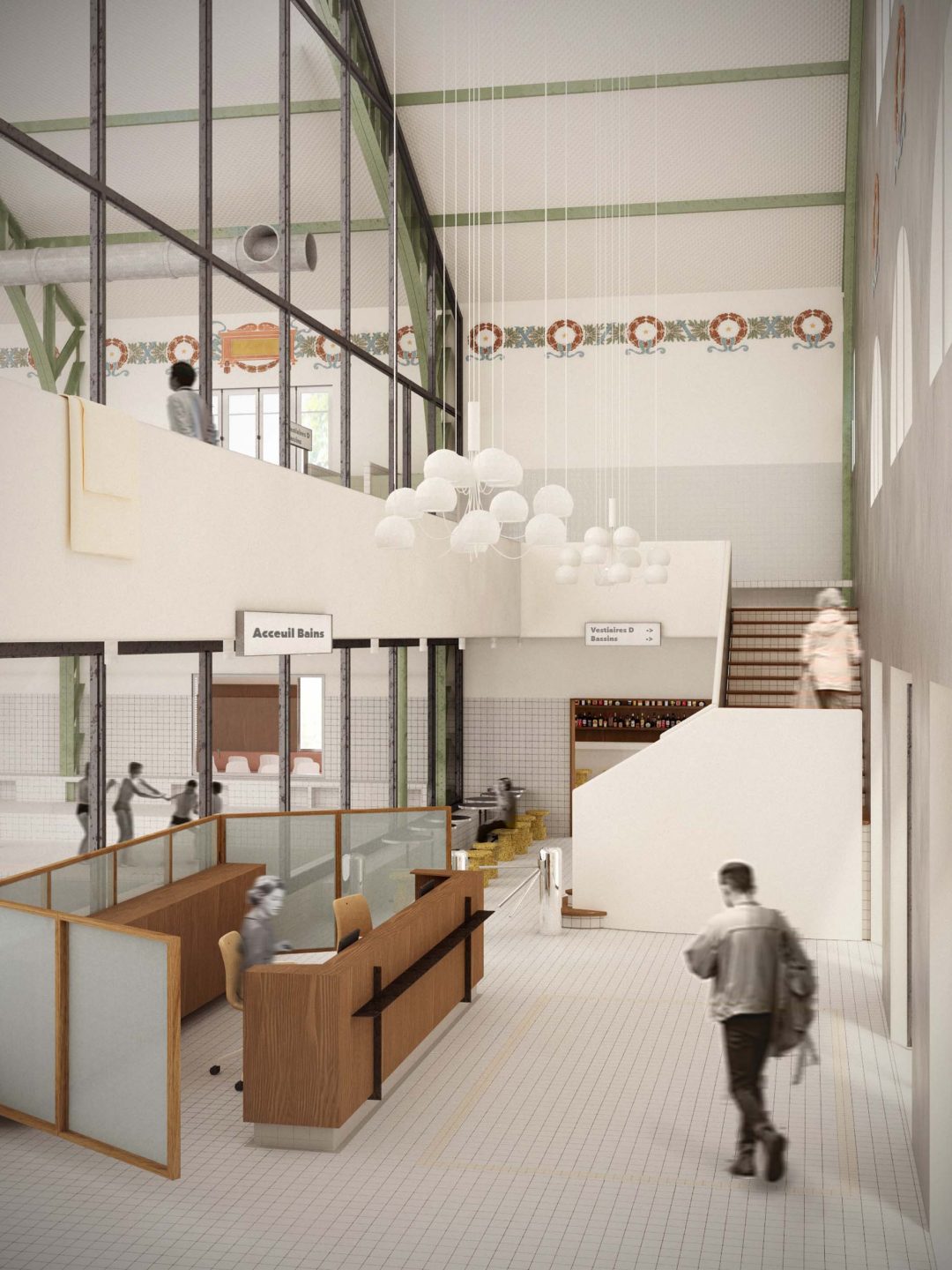 Indépendamment de la piscine, il est possible de s’offrir un moment de détente dans le spa des Bains. L’espace d’accueil et les vestiaires aux courbes sensuelles donnent accès à un sauna, des salles de massage et un hammam au sous-sol, liés entre eux, comme au reste du bâtiment, par l’utilisation d’un carrelage unique.