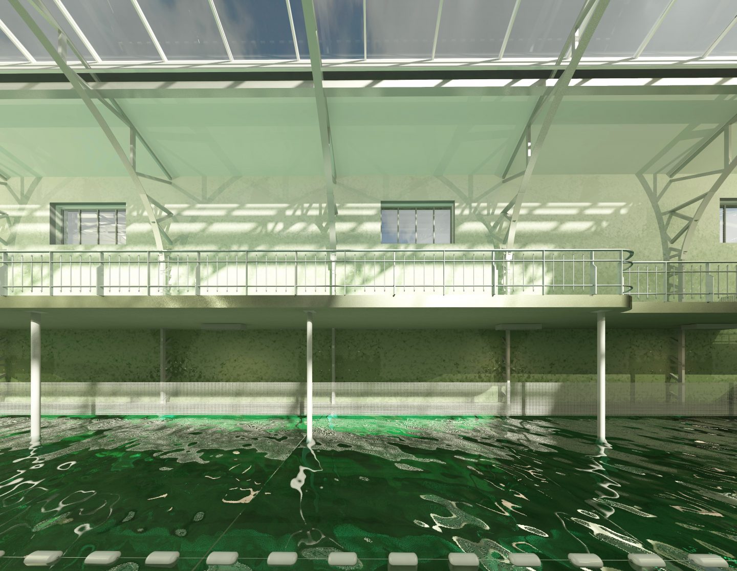 Le parcours dans le bâtiment a été pensé comme un rituel le long de l’aile Sud. On se déchausse après le hall d’entrée, puis on passe le pédiluve, instaurant directement la notion du respect du lieu et des autres. Après le passage au vestiaire et à la douche en pluie, on rentre dans le grand volume du bâtiment et son étendue d’eau.