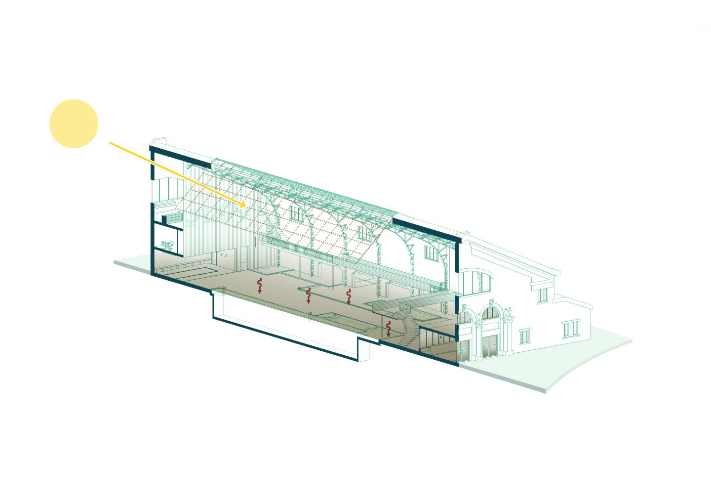 Tous les éléments rajoutés sont pensés en structure légère avec une esthétique discrète pour valoriser au maximum le volume existant et ses charpentes industrielles.