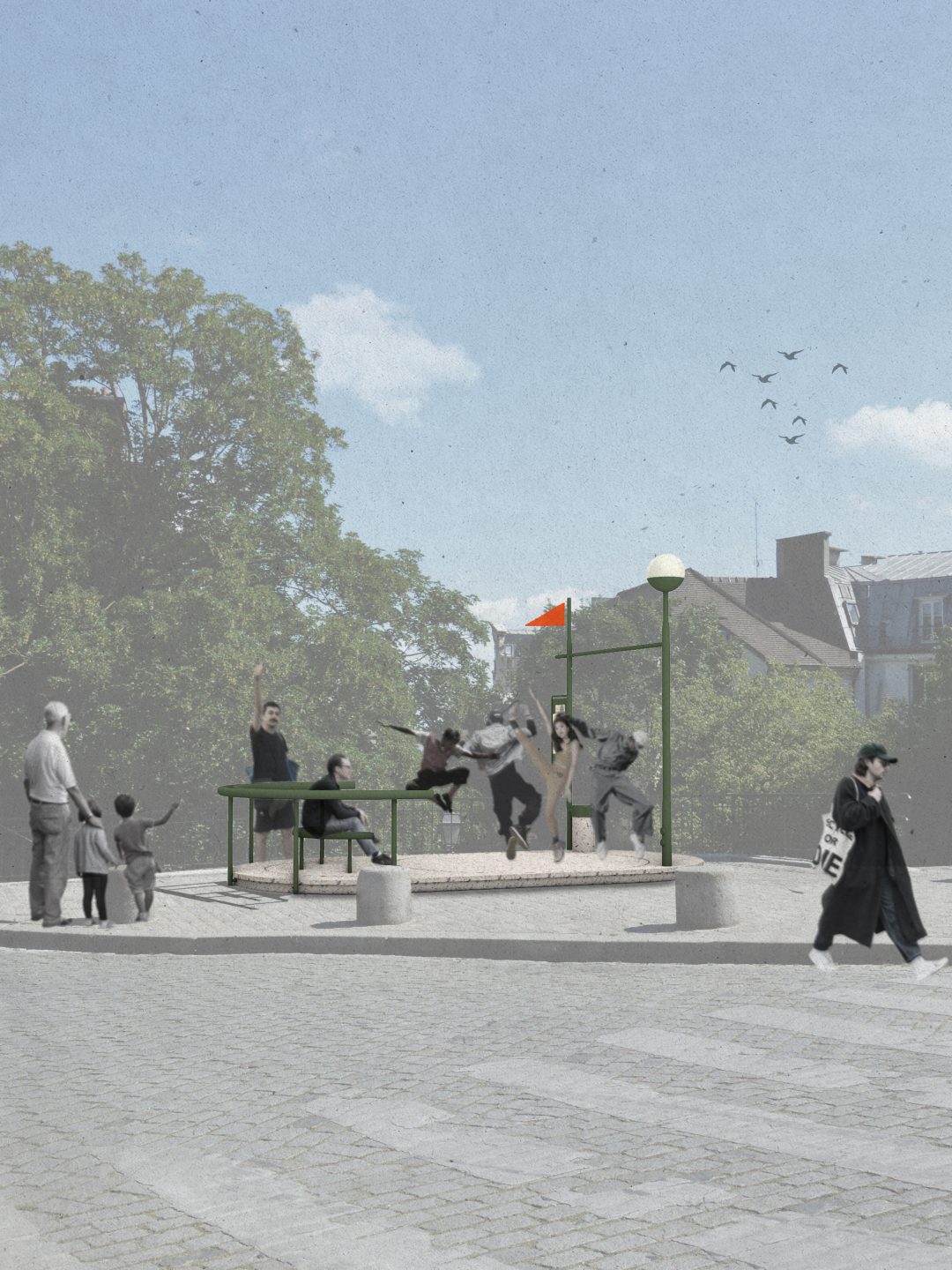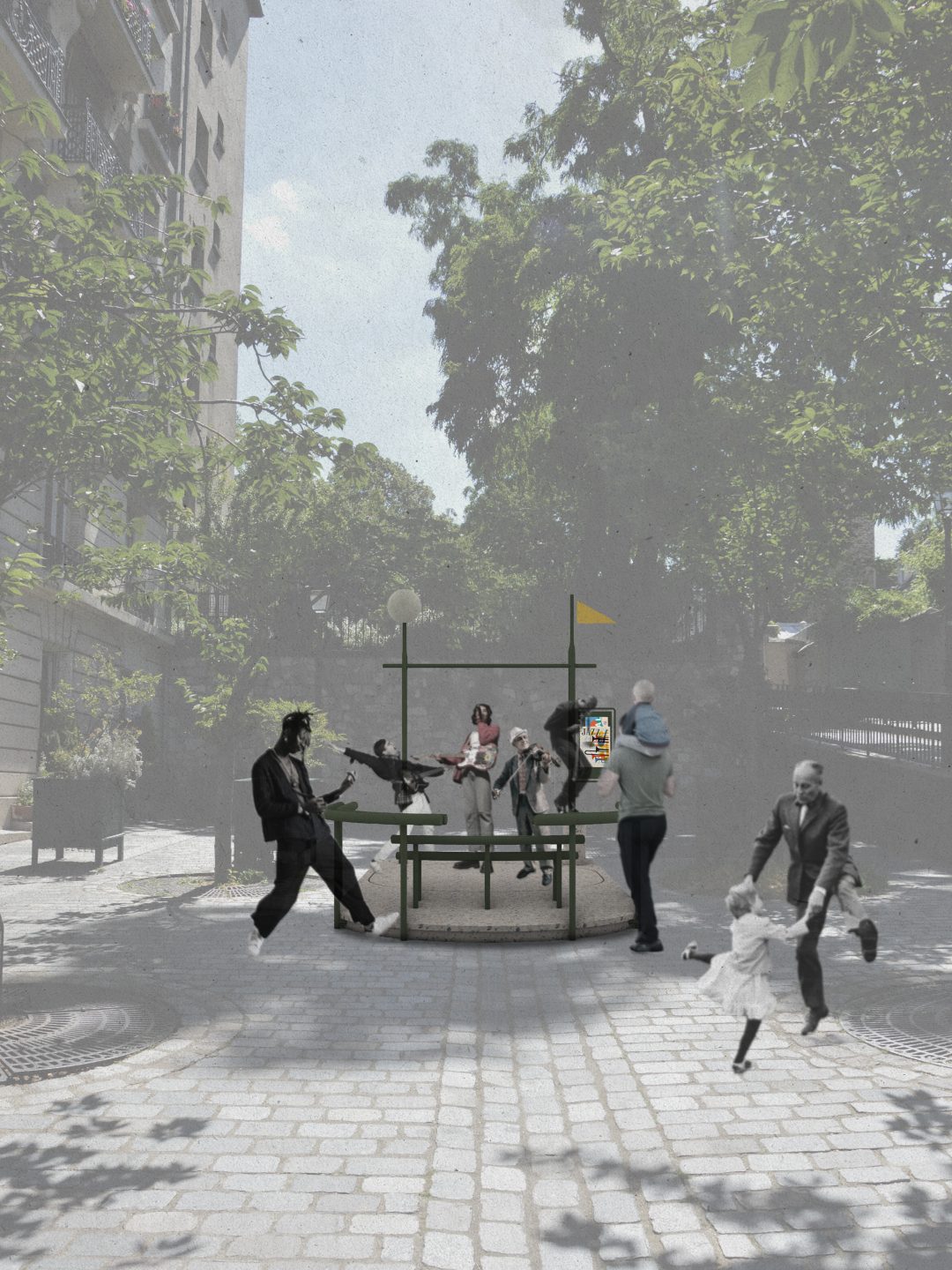 Présents depuis le XVIIè siècle, les artistes de rue: troubadours, ménétriers, conteurs ou chanteurs qui distrayaient et occupaient la rue, est un patrimoine incontestable de la capitale. Cet art éphémère et multiple a pour unique but de nous surprendre, nous émerveiller et égayer nos journées dans la grisaille citadine. Dans une démarche de survie et valorisation de ces arts, mon projet propose des lieux scéniques dans les rues et places parisiennes. En m’associant avec le collectif Les Oiseaux de Montmartre, qui réunit des artistes de rues, une scénographie de trois micro-architectures créé des espaces dédiés à ces arts. Ce projet aspire à proposer des surprises artistiques et une pause culturelle gratuite, libre et pour tous, lors de balades et parcours quotidiens.